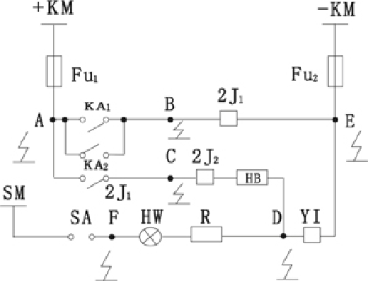 负极接地可能造成断路器的拒绝动作,如图所示,当图中的B点,E点同时接地,B、E点通过地构成了回路,即B、E点相接将中间继电器2J1短接,此时,如果系统发生事故,保护动作由于中间继电器2J1被短接,2J1不工作,断路器不会动作,产生拒动现象,使事故越级扩大。同理,当图中的E点和C点同时接地和图中的E点和D点同时接地均可能生成断路器拒动现象。