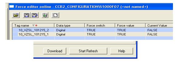 如果开关量,点击强制列表里Force switch为强制允许开关,点击FALSE为TRUE允许强制,Force value False为0,Ture为1,点击完成强制操作后按下右下角Download实现强制。具体查看状态,点击右下角,start refresh(开始刷新) ,查看 FORCE SWITCH 为 TRUE  ,FORCE VALUE 为 强制值。取消强制同理,强制列表里Force switch为强制允许开关,点击TRUE为FALSE不允许强制,Force value里强制值恢复最初状态,最后按下Download实现强制取消。(注意,只有先stop refresh 才能Download)
